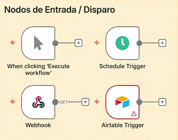 - En n8n: usa Trigger nodes (Webhook, Cron, App-specific).